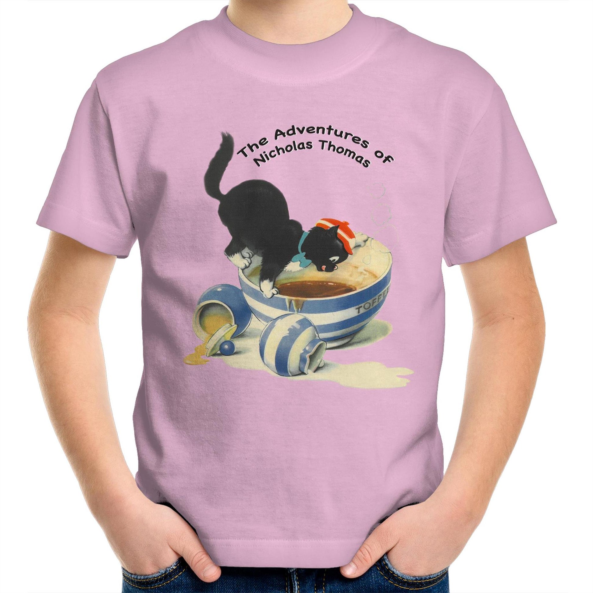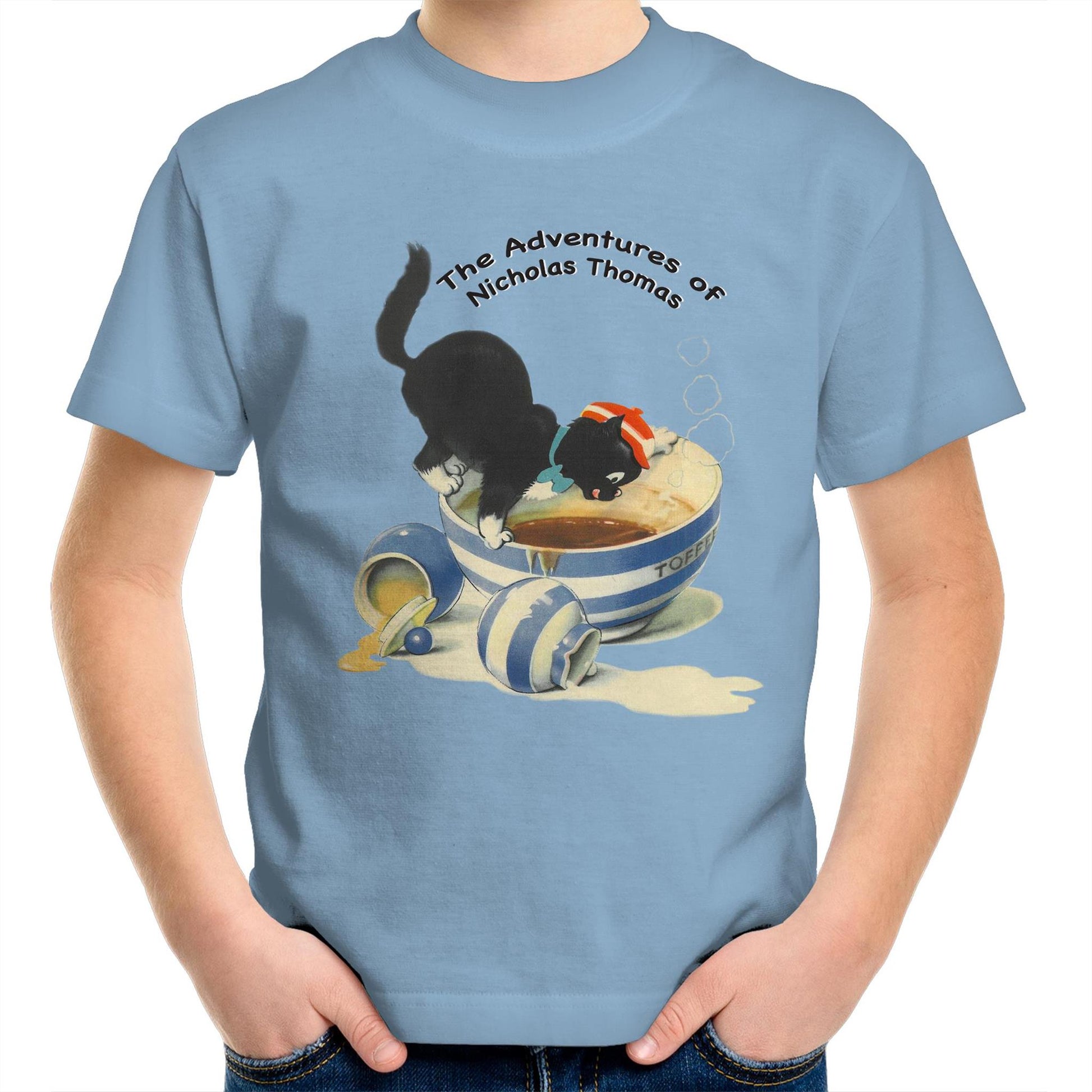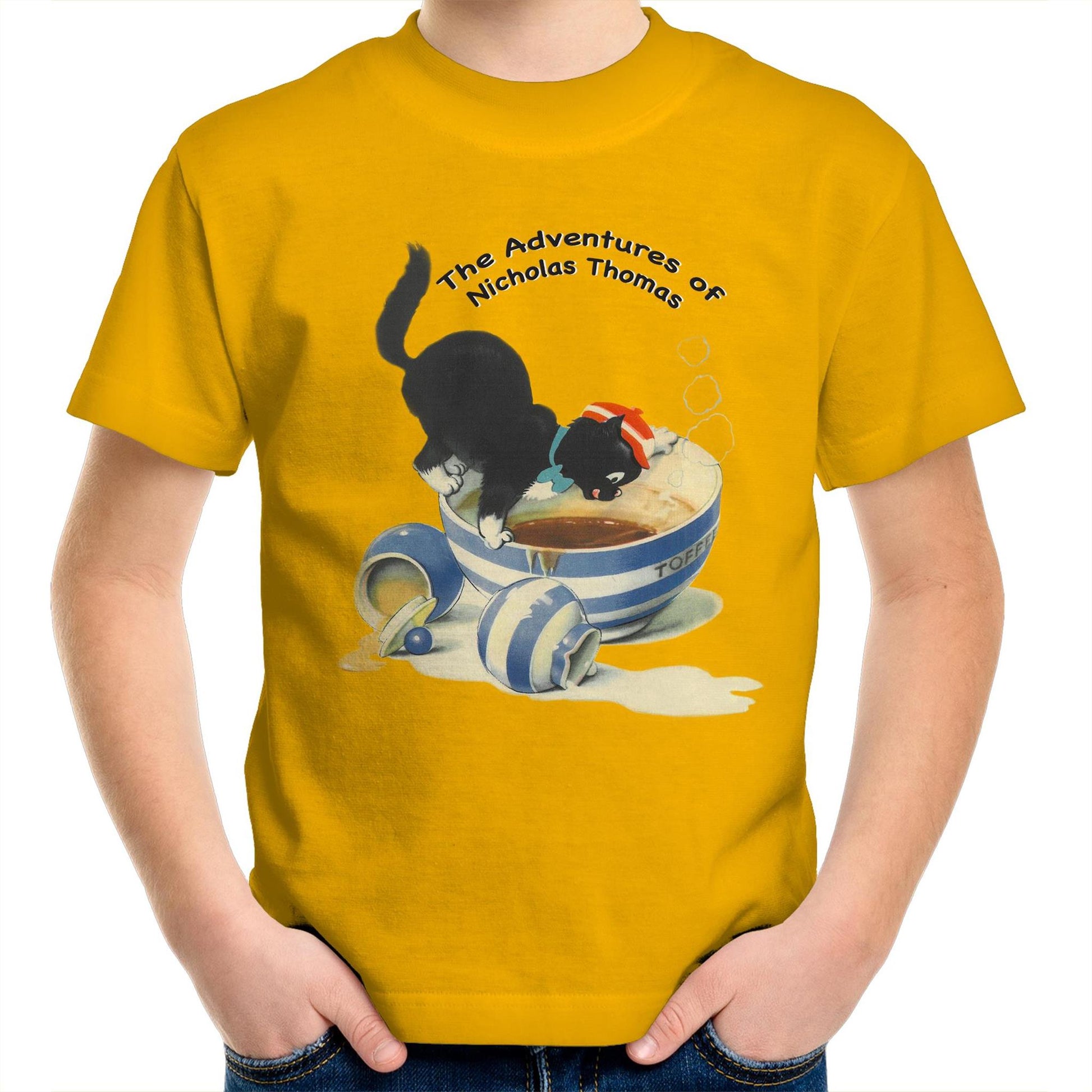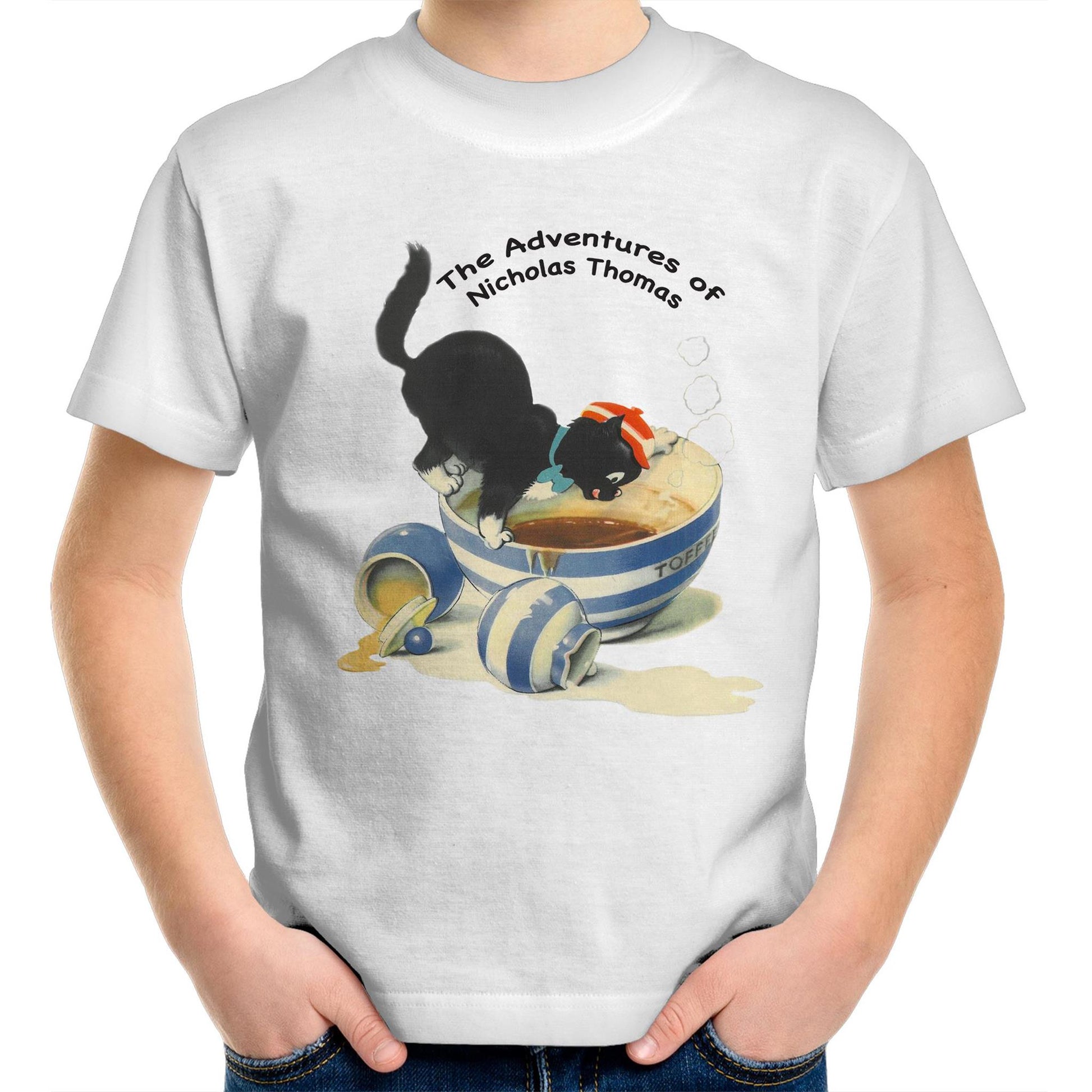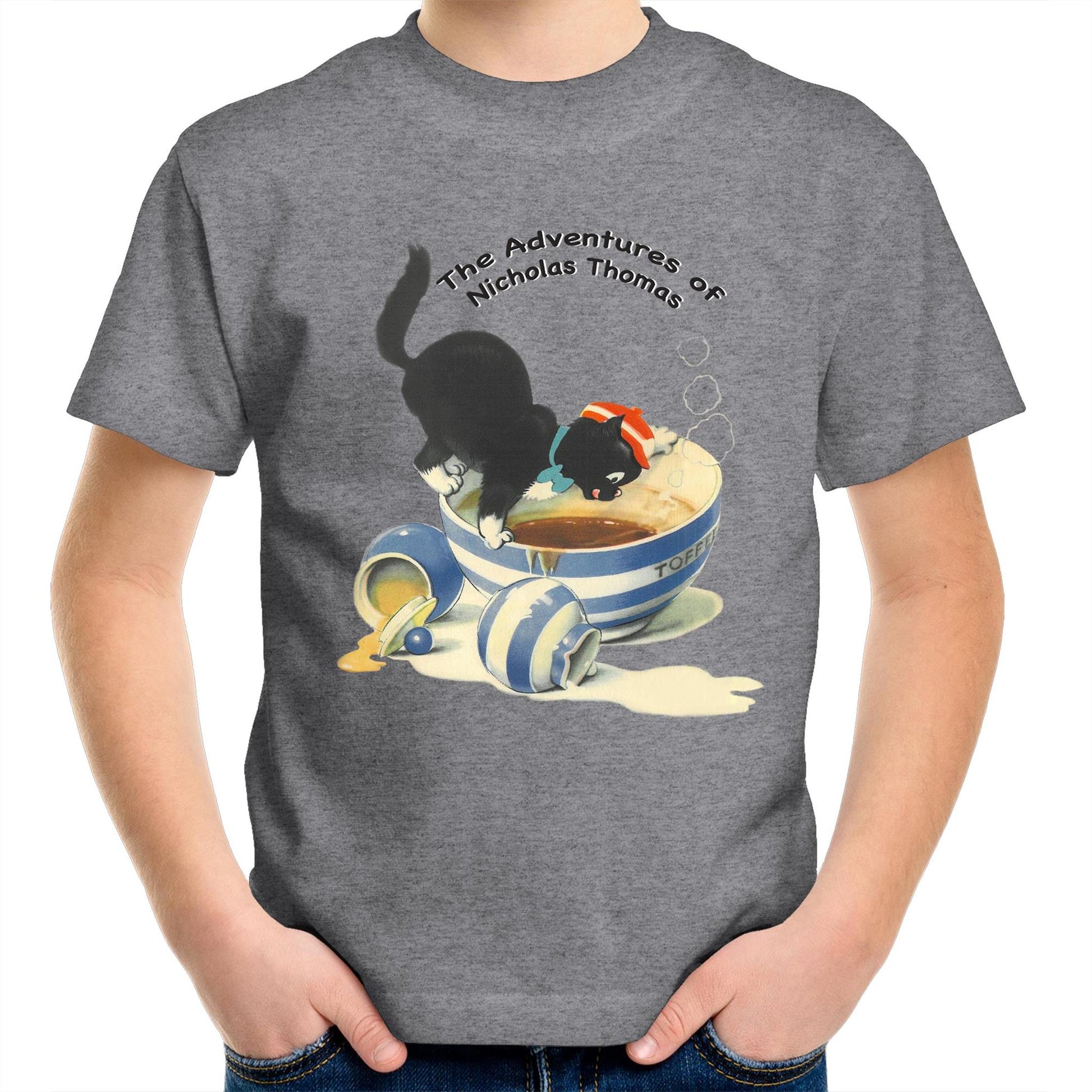 This Regular fit,Kid's T-Shirt Features the Adventurous Cat 'Nicholas Thomas' from the 1950's Children's Books by Kitty Styles. crew neck, mid-weight, 180 GSM, 28-singles, 100% combed cotton (marles 15% polyester). Neck ribbing, side seamed, shoulder to shoulder tape, double needle hems, preshrunk to minimise shrinkage