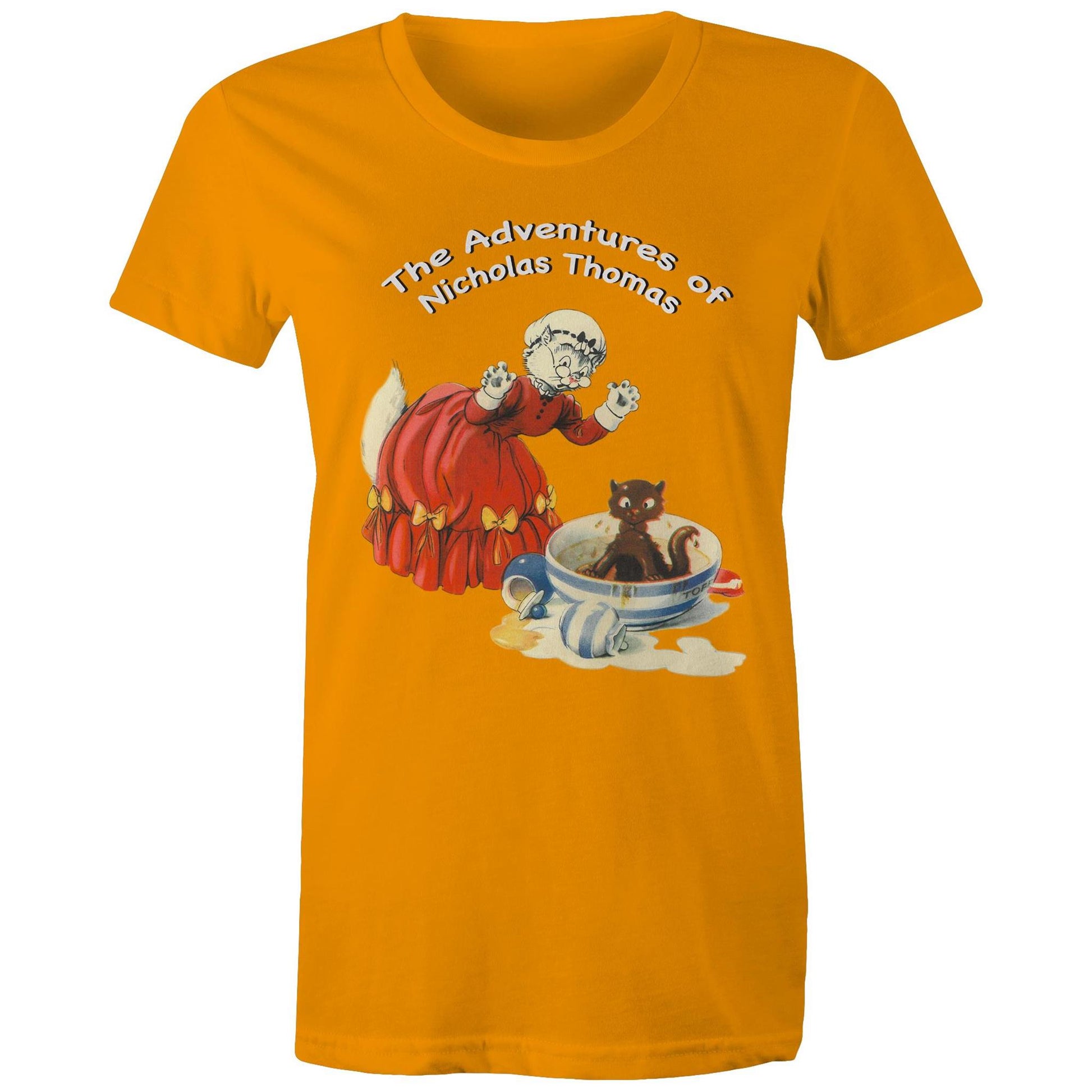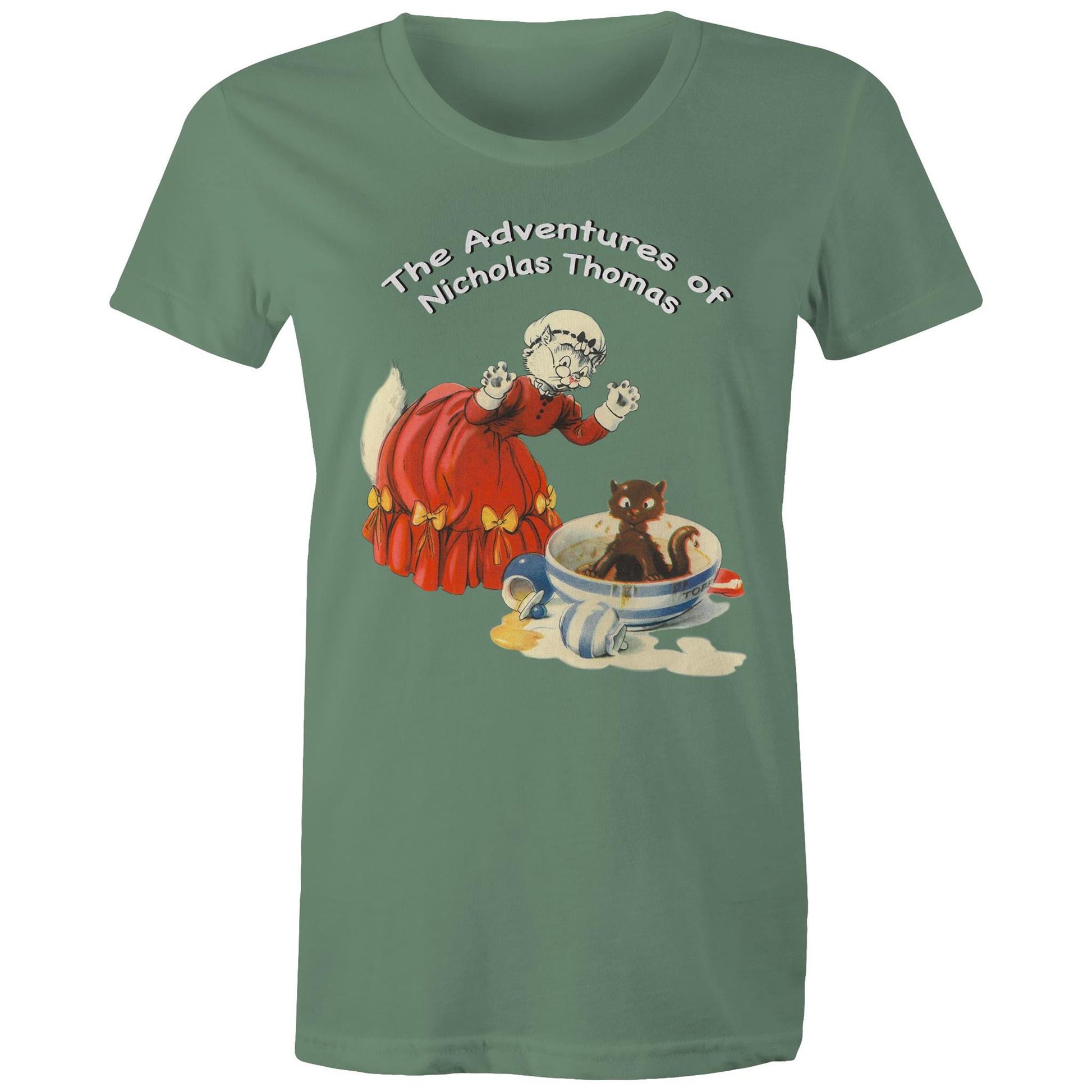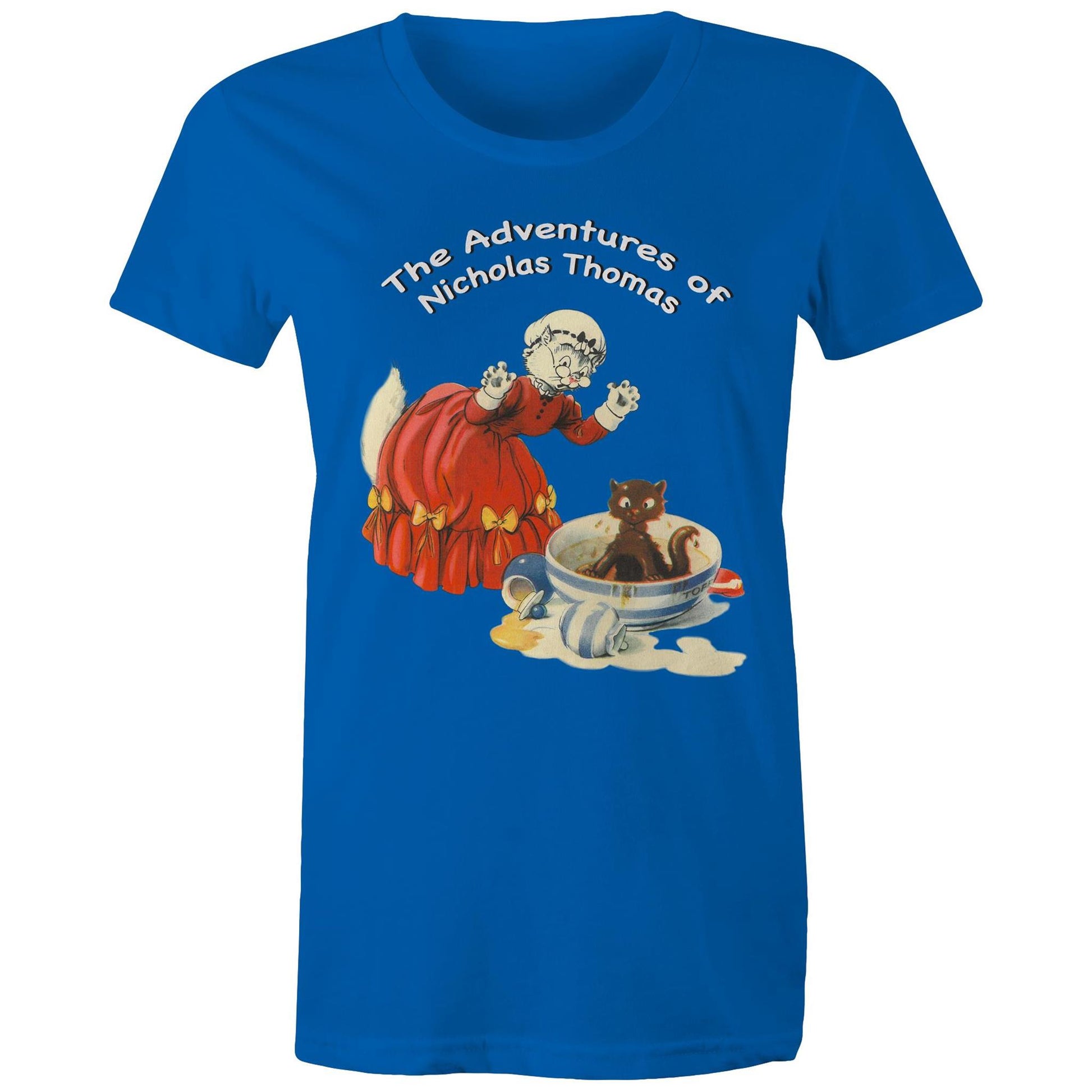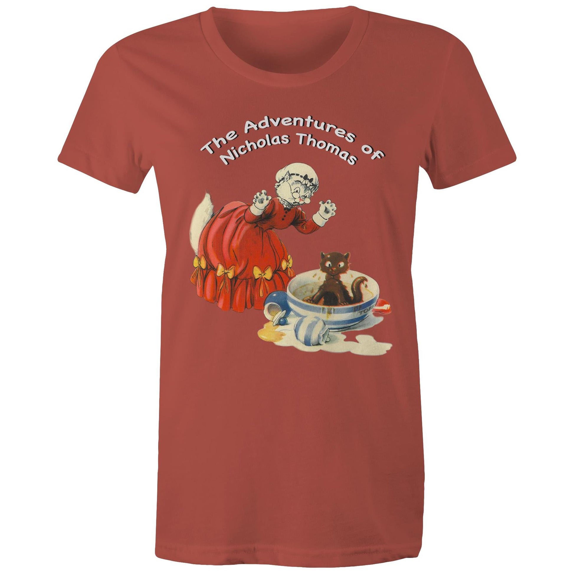 This Regular fit Women's T-Shirt Features the Adventurous Cat 'Nicholas Thomas' from the 1950's Children's Books by Kitty Styles.